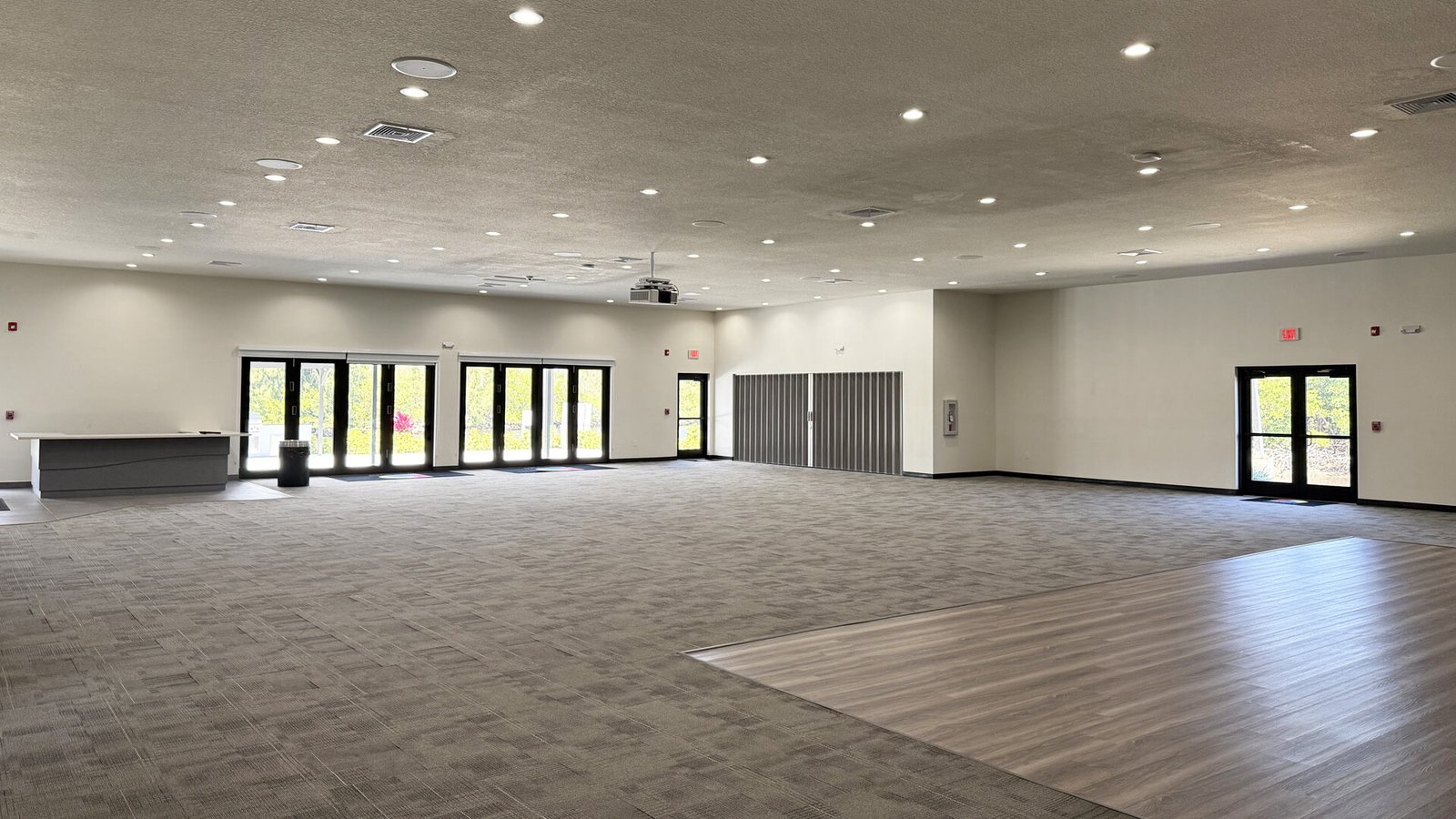 Flexible spaces: Banquet hall, meeting room, kitchen, and patio.